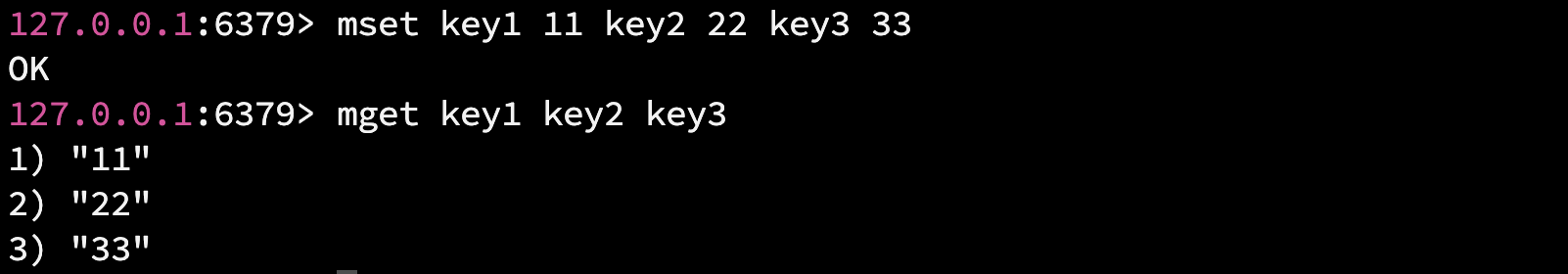 | mset key value [key value ...] | 批量设置指定的 key 和 value | O(k), k 是键个数 |