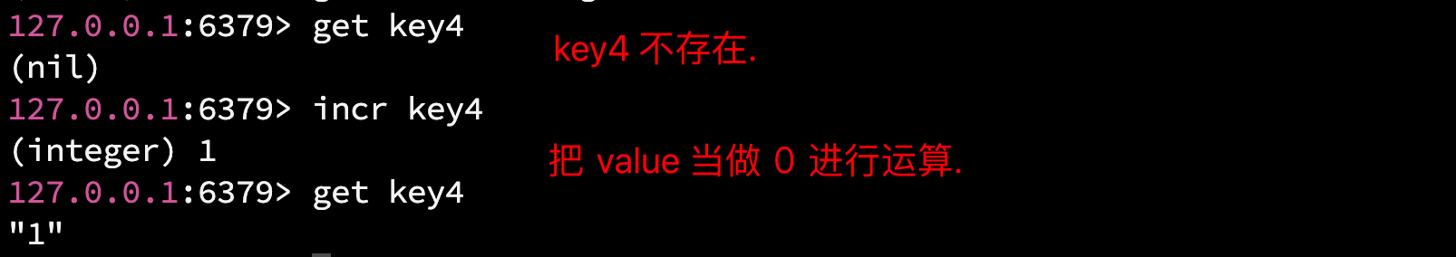使用上述命令时, 如果 key 不存在, 则把 value 当做 0 进行计算: