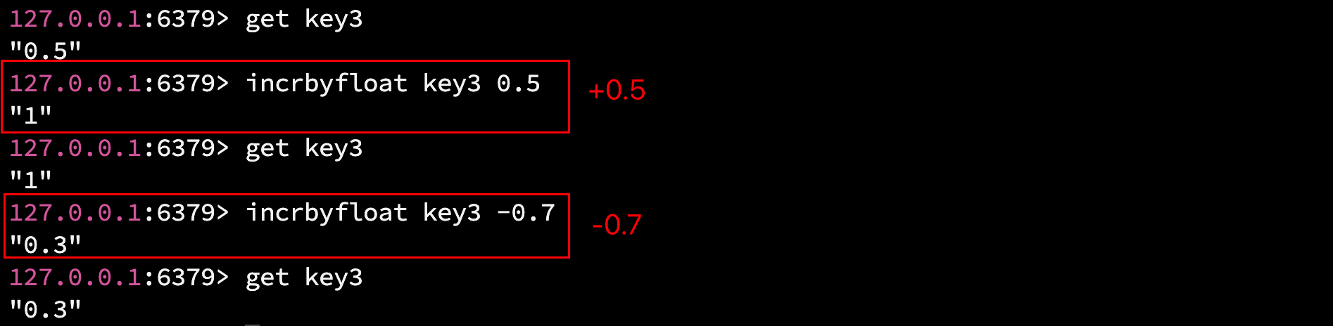 - incrbyfloat key 小数 : 针对 value +/- 小数