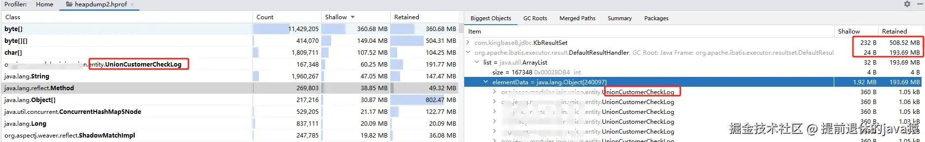 导出堆转储文件,用工具打开就行了,下图也是之前解决OOM时候记录JProfiler打开的图片,很清晰的能看到各对象的大小,以及对象的GC ROOT 我们去排查各大对象对应的代码就行了: