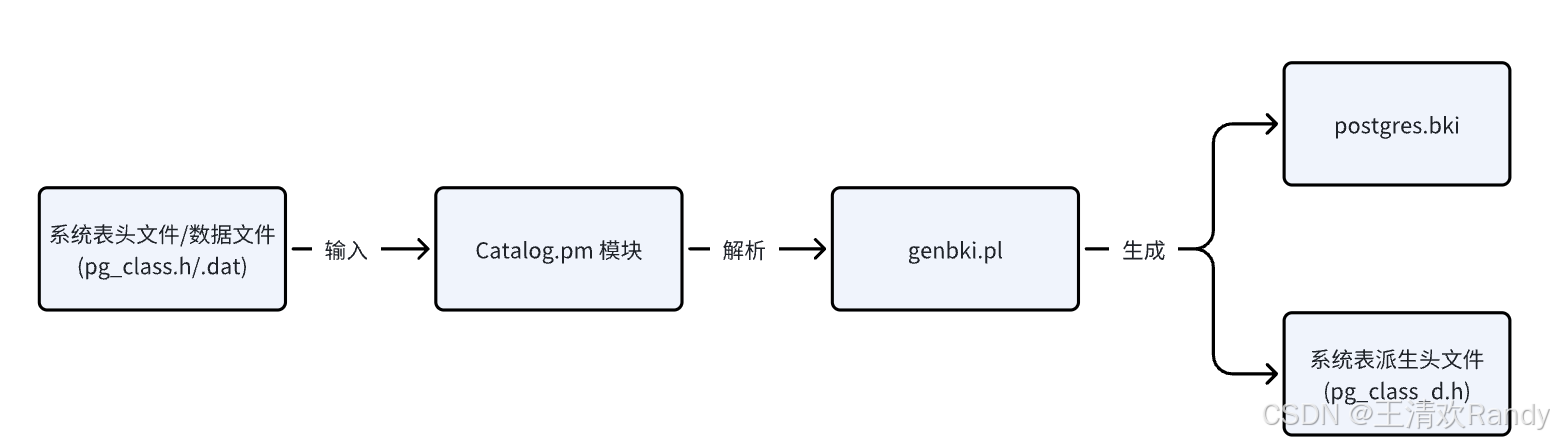 而引导脚本postgres.bki是在编译阶段通过 src/backend/catalog/genbki.pl 和 src/backend/catalog/catalog.pm 根据src/include/catalog路径下的系统表头文件.h和数据文件.dat生成的;该脚本生成之后被放到 PG 安装目录的 share/postgres.bki 路径下,在使用 initdb初始化数据库时执行该脚本创建并初始化系统表