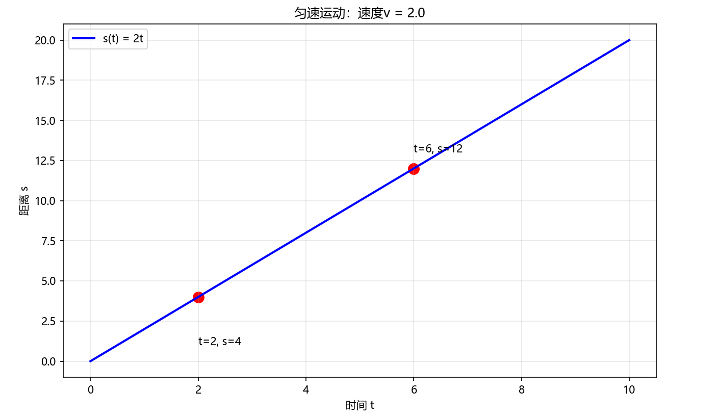 当质点 PPP 做匀速运动时,若运动距离 sss 与运动时间 ttt 的关系记为 s=s(t)s = s(t)s=s(t),则比值 s(t1)−s(t0)t1−t0\frac{s(t_1) - s(t_0)}{t_1 - t_0}t1−t0s(t1)−s(t0) 表示质点的运动速度。