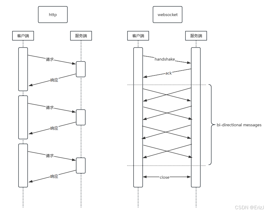 - 传统 HTTP 请求是 客户端发起 → 服务器响应 → 连接关闭 的模式,而 WebSocket 则是 客户端和服务器建立一个持久连接,之后可以 双向自由传输数据,不需要每次都重新建立连接。