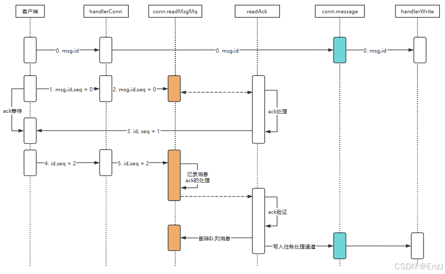 - 所有新消息先去队列检查重复 → 放入队列 → 通过 readAck 确认 Ack → 投递到处理通道,保证顺序和可靠性;不需要 Ack 的消息直接投递到处理通道。