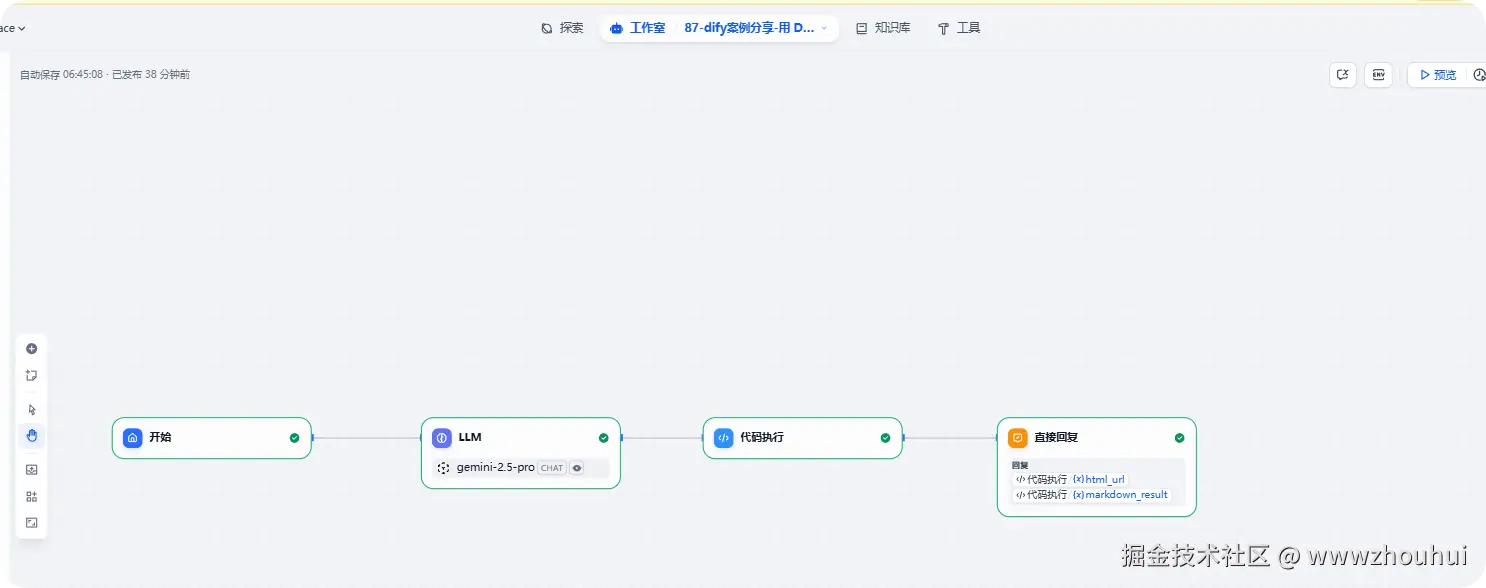 这个工作流主要有哪些组成部分构成的呢?我们通过上面的截图就可以看出它主要有开始节点、Agent、LLM大语言模型、代码执行、直接回复组成。