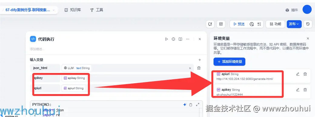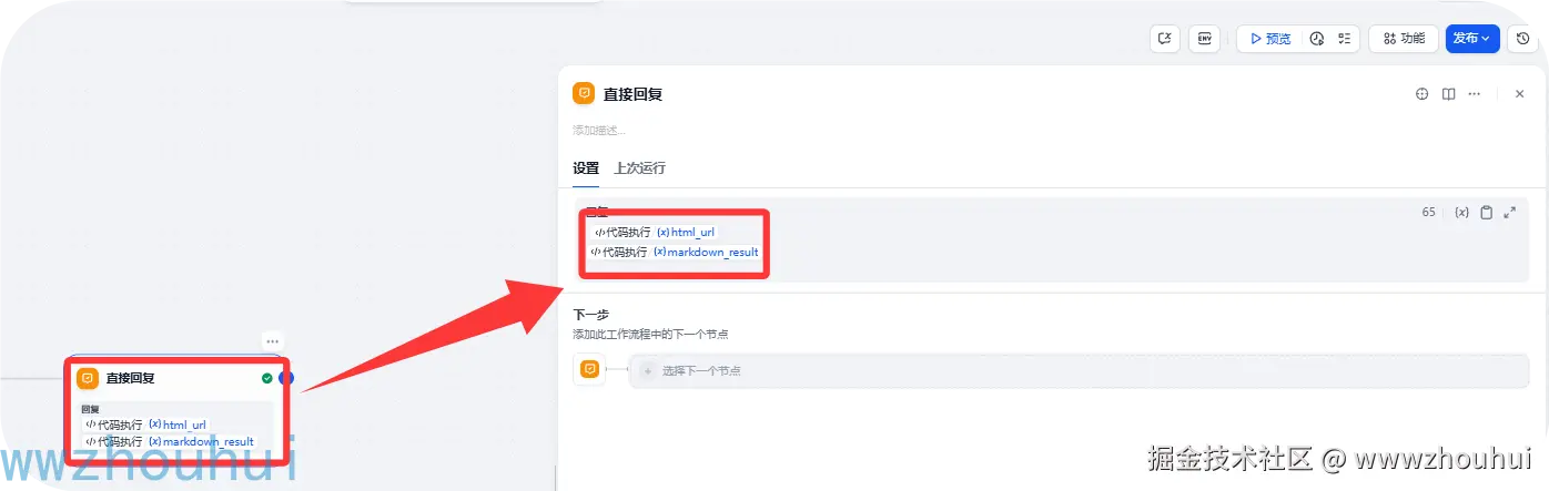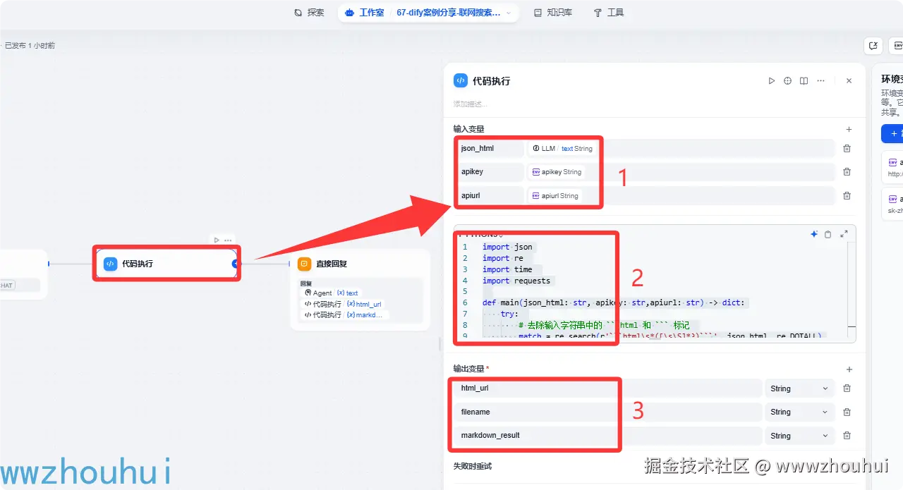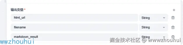 输入变量 我这里设置三个html_url、filename、markdown_result 返回的变量类型是string