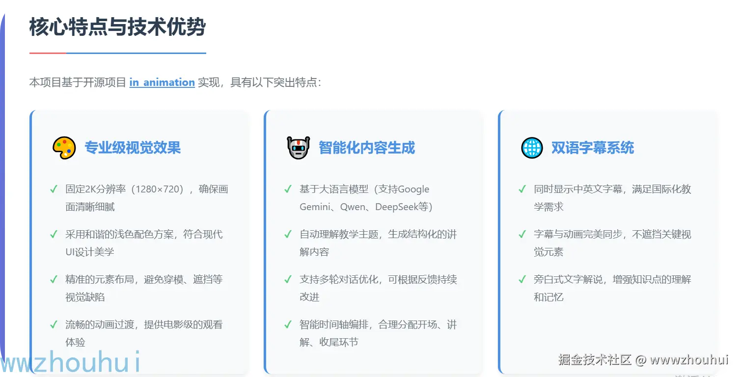 AI辅助生成精美动画HTML技术的出现,彻底改变了这一局面。它是一种结合了人工智能大语言模型和现代Web技术的创新解决方案,能够根据用户输入的教学主题,自动生成视觉精美、内容准确、交互流畅的HTML5动画页面。这些动画页面不仅可以在浏览器中直接播放,还能导出为MP4视频或GIF格式,便于在各种教学场景中使用。