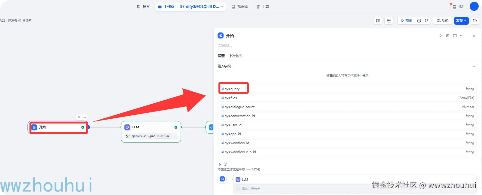 这个开始节点我们这里就没有设置用户定义的提示词,就用sys.query的提示词。配置内容如下: