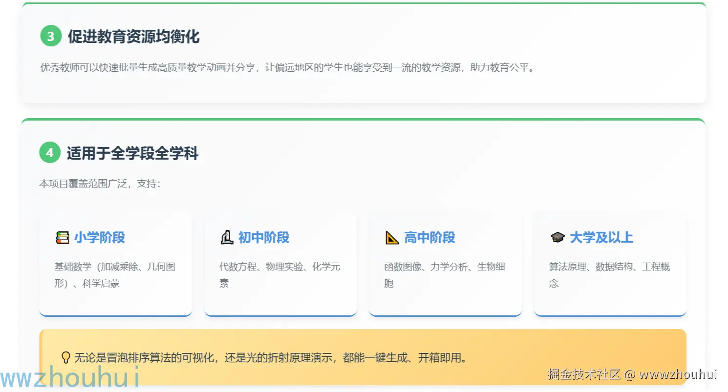 你可以基于各种数学、物理、化学、生物、计算机原理等生成各种科普类视频,该项目涵盖了小学、初中、高中、大学各种原理理解。