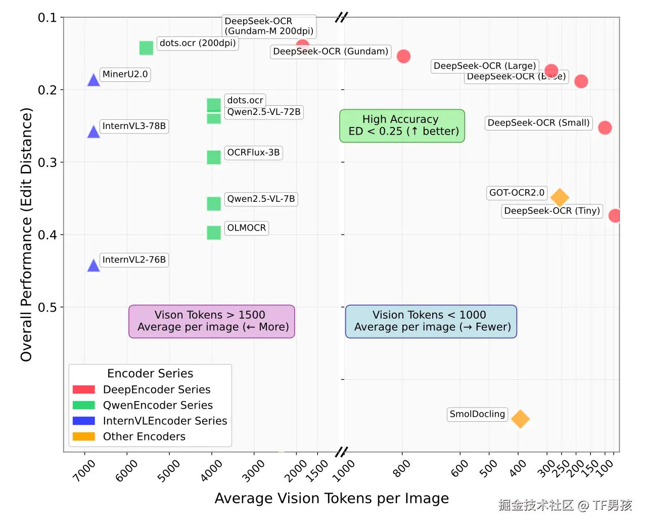 大语言模型目前有个问题,内存爆炸(健忘)。也就是你和他聊了半个小时,他只记得最近十分钟的事情。那我有几百页的报告,一部百万字的小说,它很崩溃。于是,这个方案将聊天生成图像数据。前特斯拉AI总监也说过,像素可能比文本更适合做输入,因为"一图胜千言"。我们人类的脑海就是浮现画面而非字符。于是,图表、表格、图像它是理解后记忆的,是读懂了的。这应该是一项"核心技术机密",DeepSeek选了开源(免费公开),因此立即获得全球关注和赞誉。