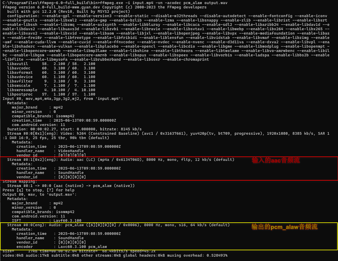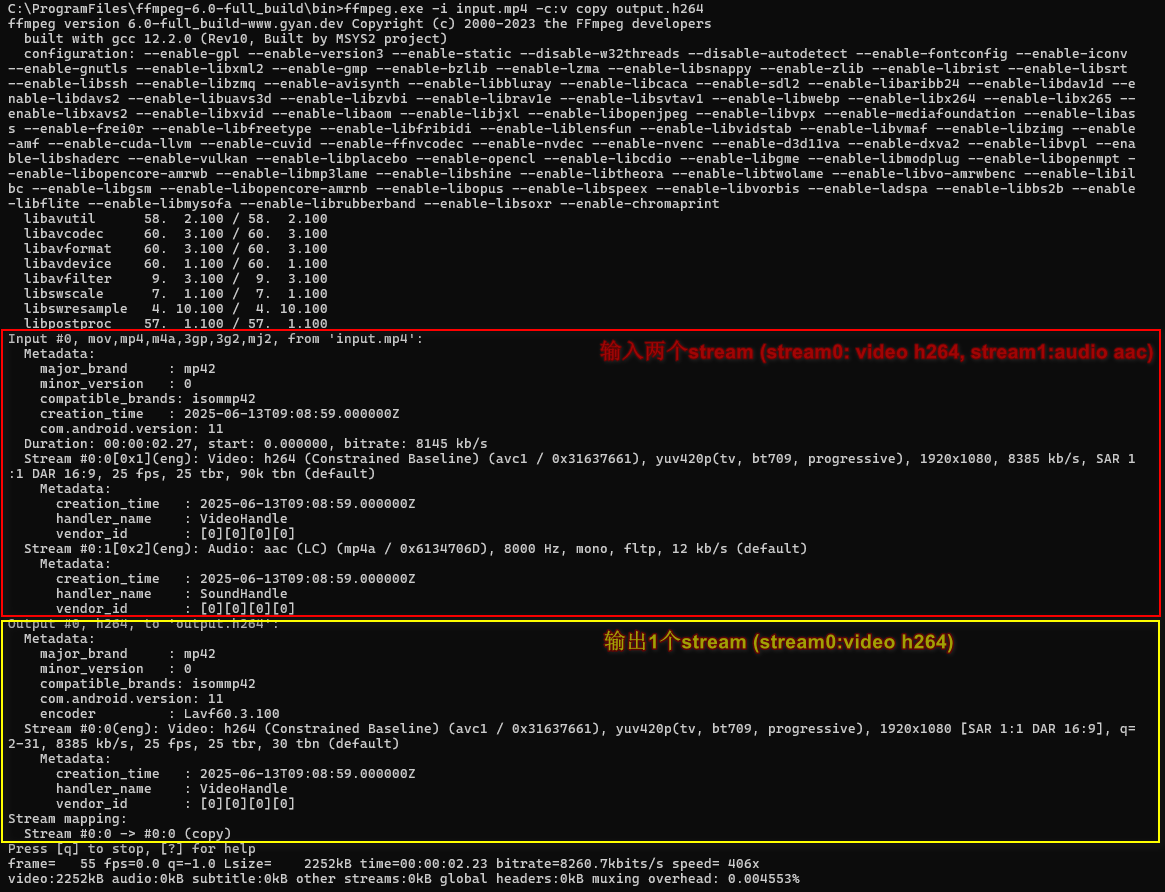 - -c 是-codec的简写,-c:v表示视频编码器,-c:a表示音频编码器