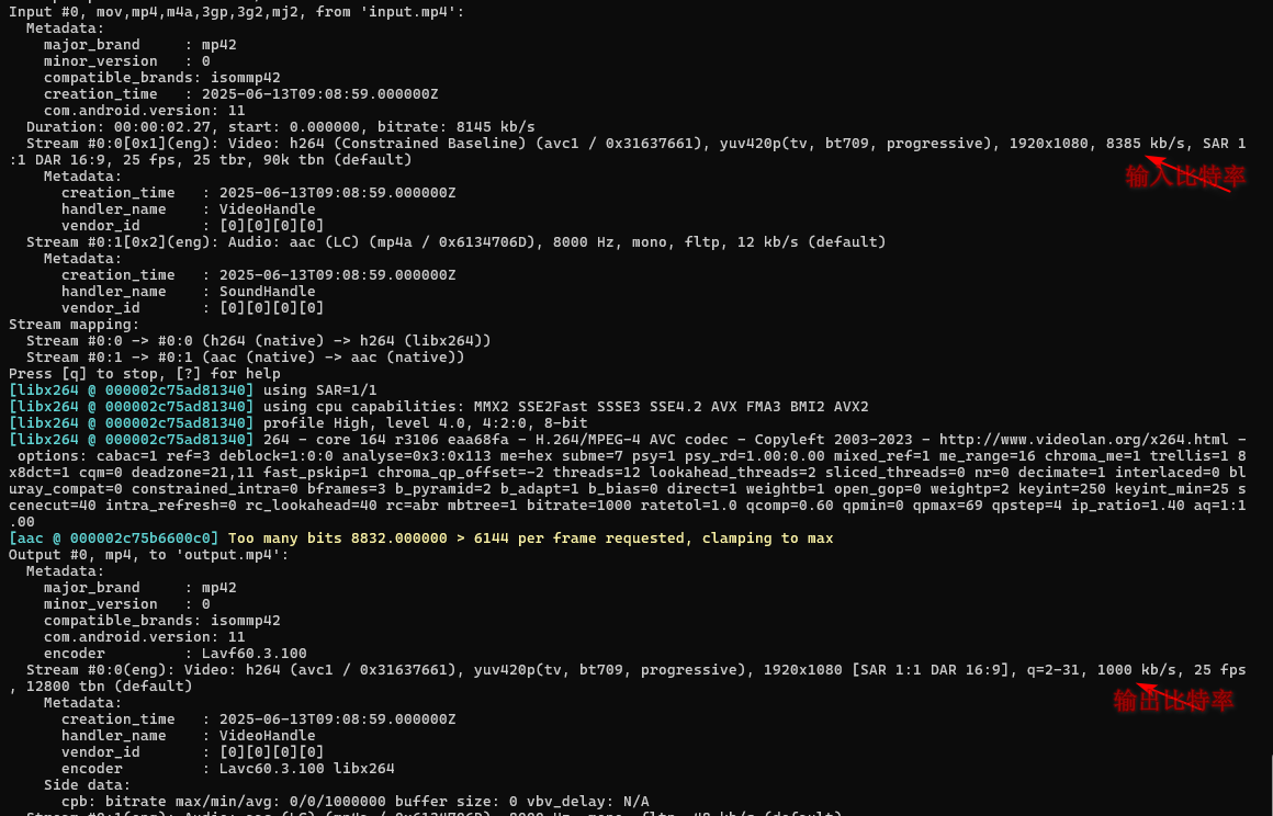 - -b:v 1000k 设置视频比特率1000k