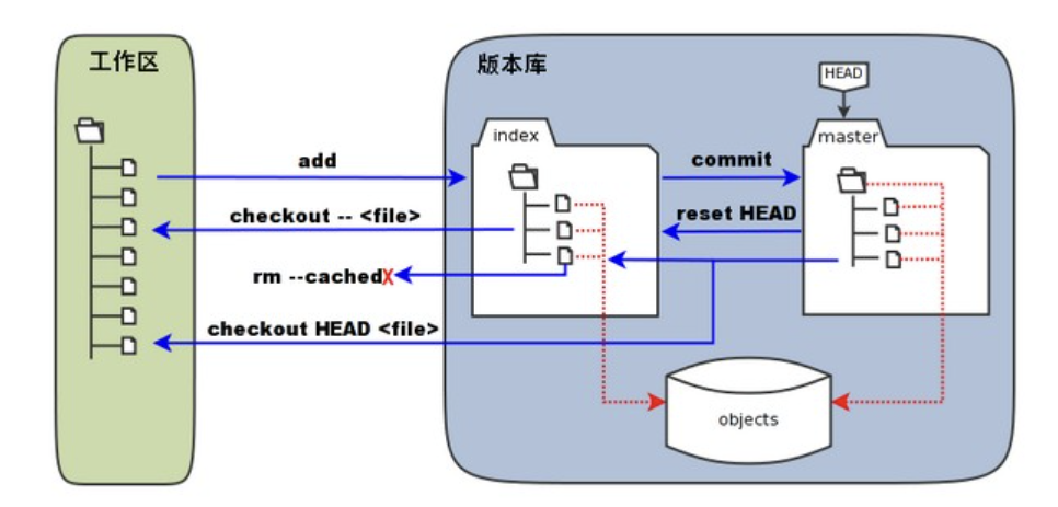 - 暂存区: 英文叫 stage 或 index。一般存放在 .git 目录下的 index 文件(.git/index)中,所以我们把暂存区有时也叫作索引(index)。