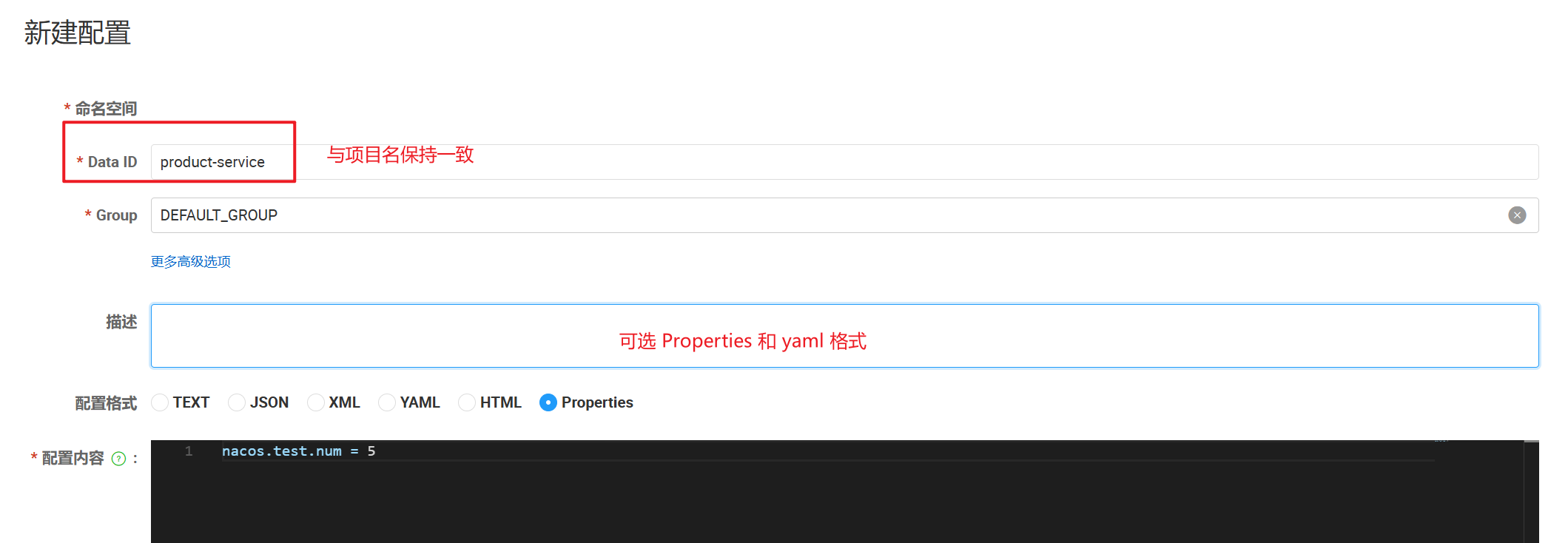 配置内容的数据格式,目前只支持 properties 和 yaml 类型
