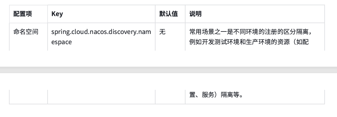 通常情况下,这几个环境之间是不能互相通信的。Nacos 提供了 namespace(命名空间)来实现环境的隔离。不同的 namespace 的服务不可见。