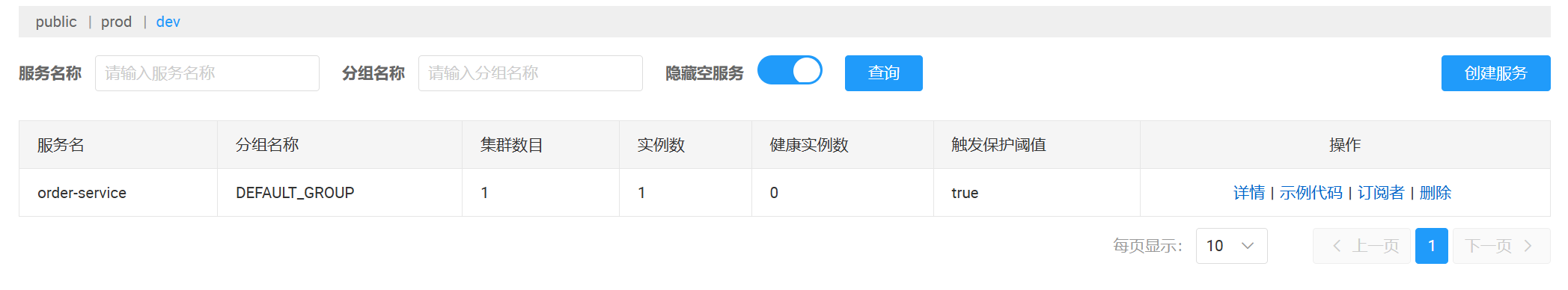 在服务管理中,发现 order-service 服务出现在了 dev 环境中~