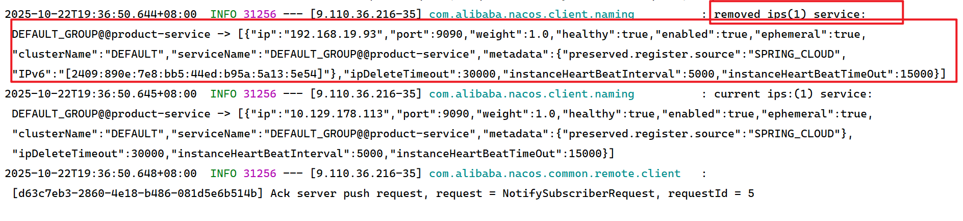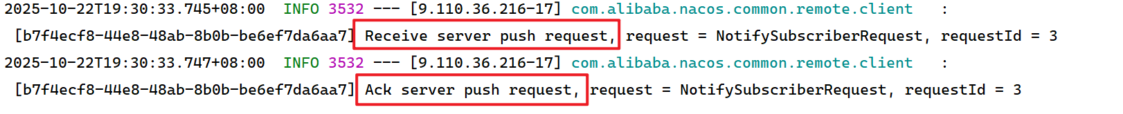 **Ack server push request:**表示 Nacos 客户端已确认收到该推送通知,并向服务器返回了已经确认收到该推送通知。