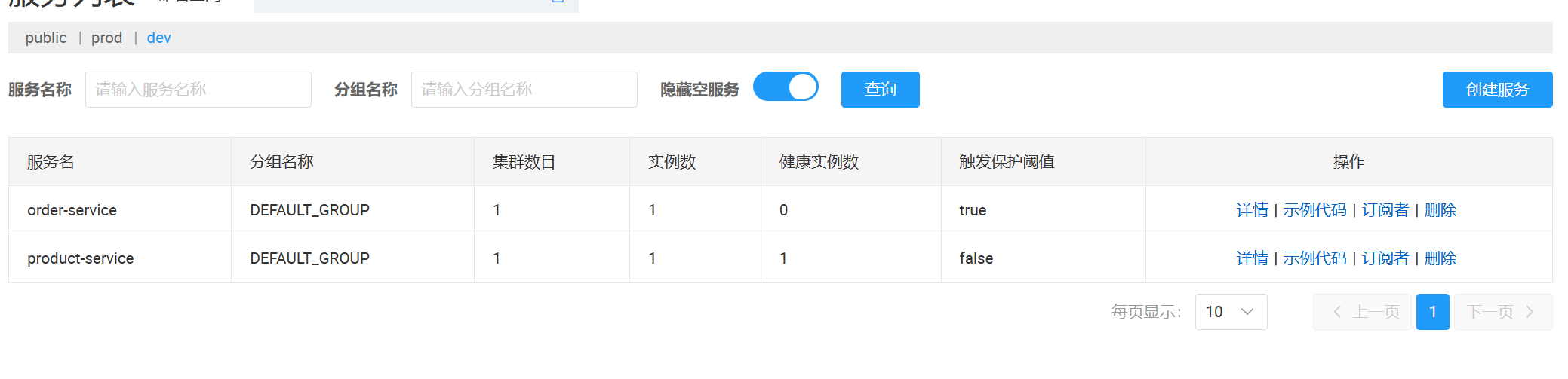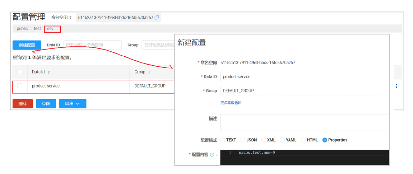修改 product-service 的其中一个实例,命名空间改为 dev: