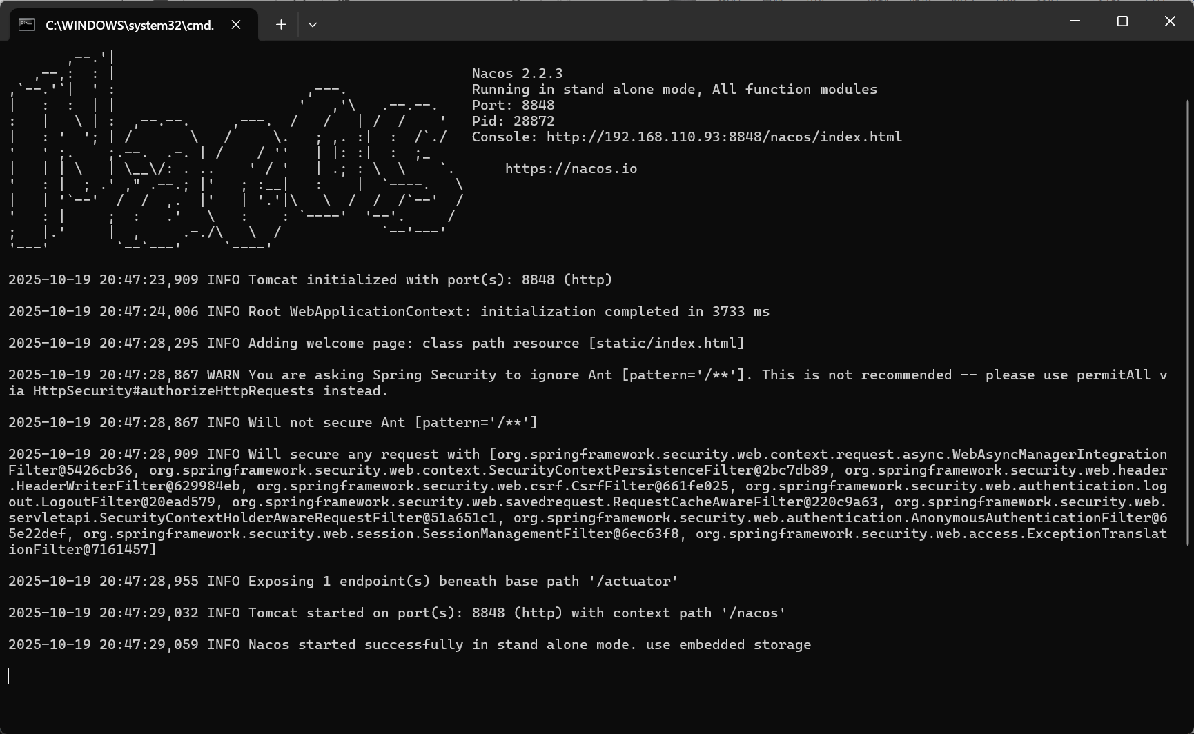 出现以下界面,表示 Nacos 启动成功