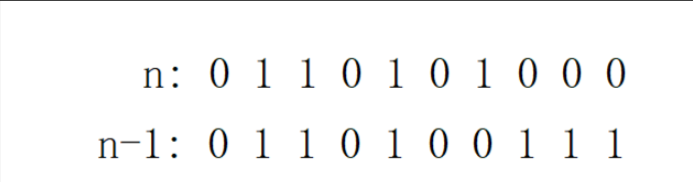 - 那么n-1后就得到与原来的n相比:最右侧的1(包括这个1)的右侧都是原来的相反数,而左侧的不变
