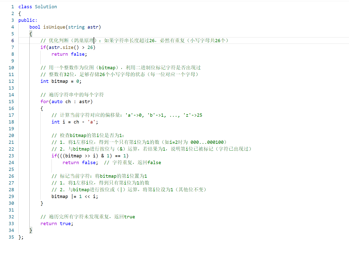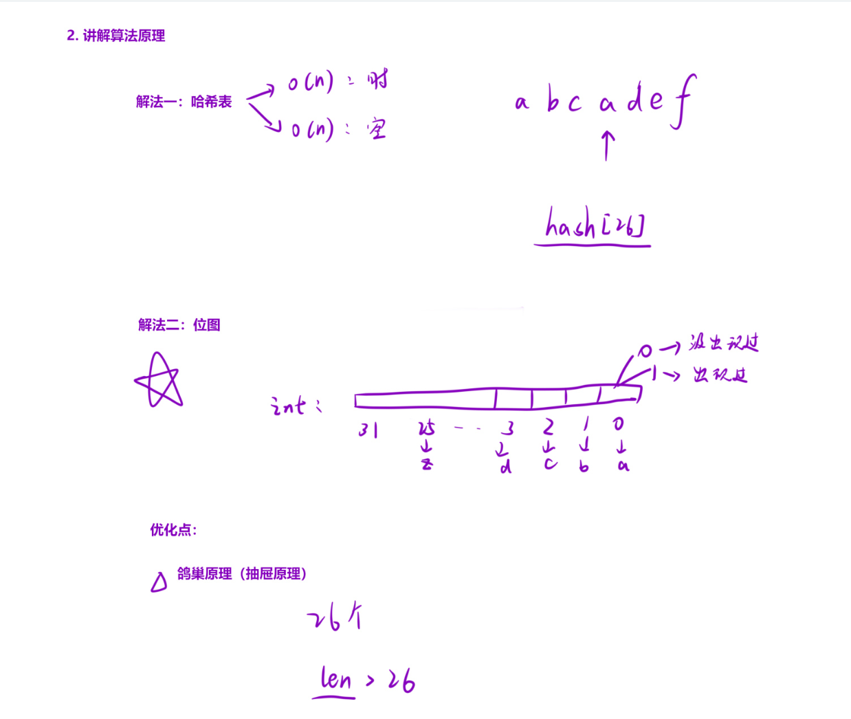 位图(bitmap)原理 :利用整数的二进制位作为 "标记位",每一位对应一个小写字母(第 0 位对应