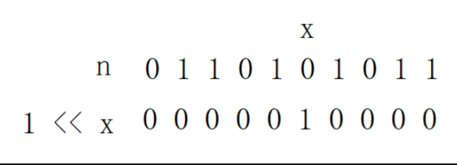 利用&(对应二进制位有0就是0)运算即可,将 n >> x后,他的第x为就在最右边,那么此时& 一个1,那么就只会得到1 或 0,如果是1,那么这个位上是1,反之则是0