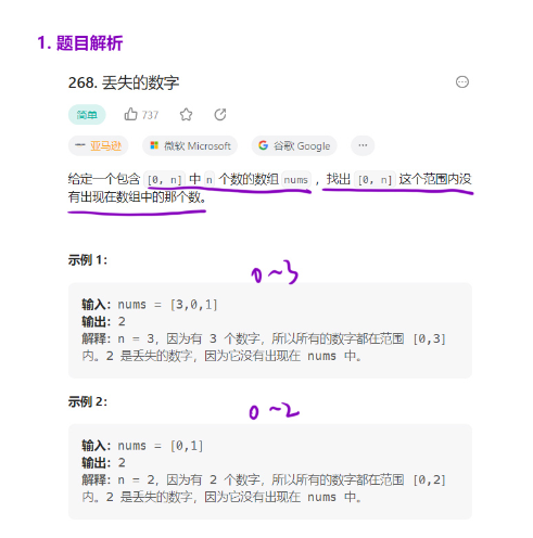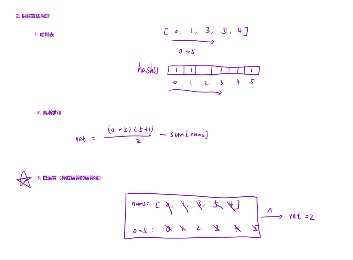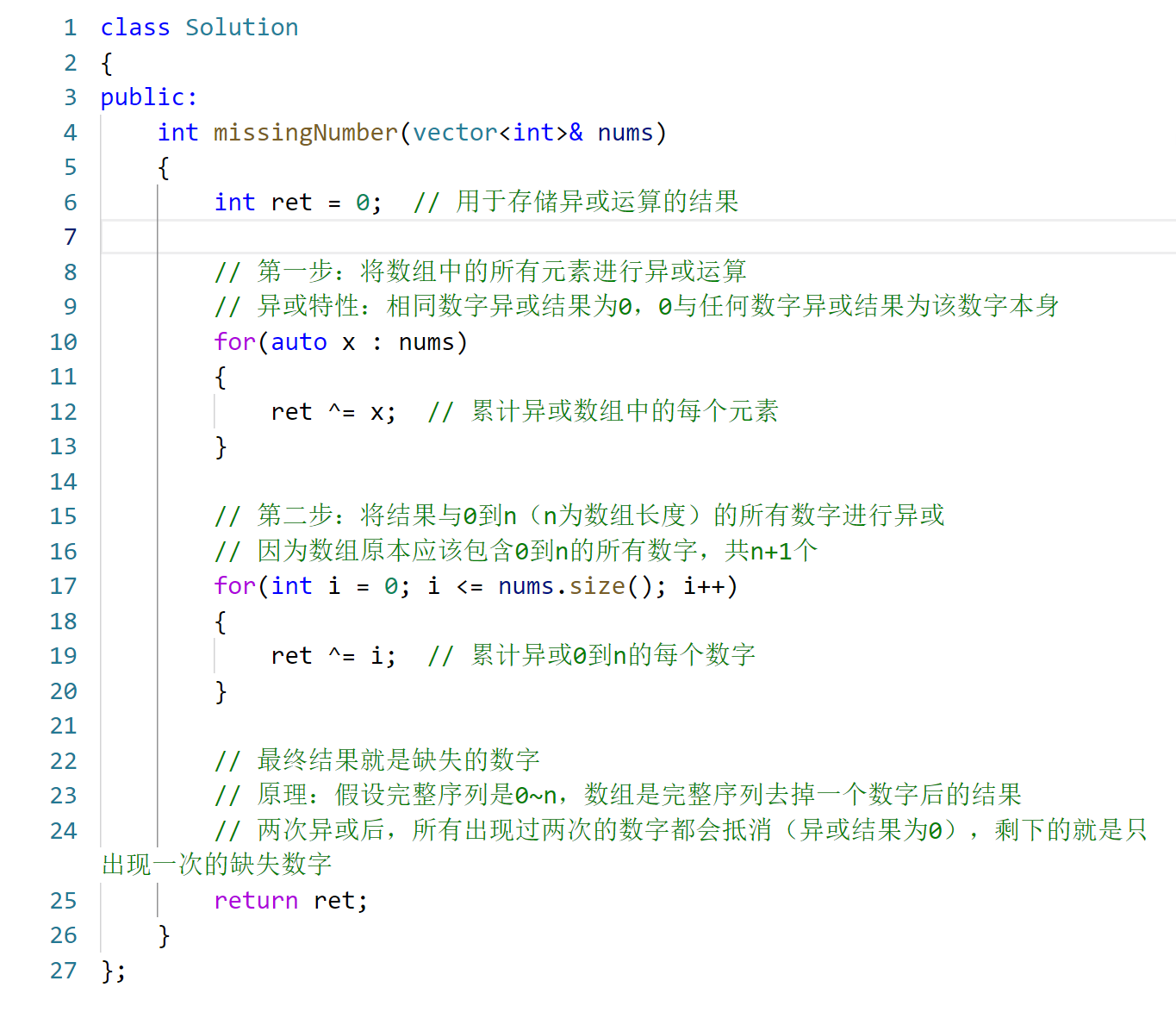 0~n中),异或后抵消为0 - 缺失的数字只在