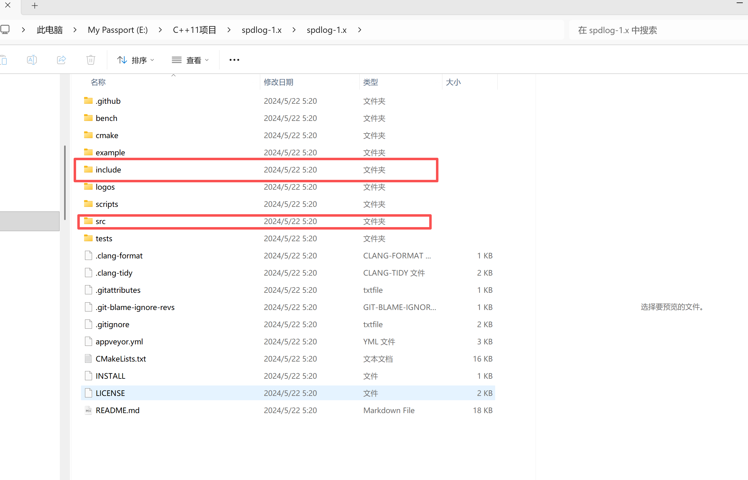 下载完成后:将项目中的include文件夹和src文件夹都拷贝到项目中,如下图。