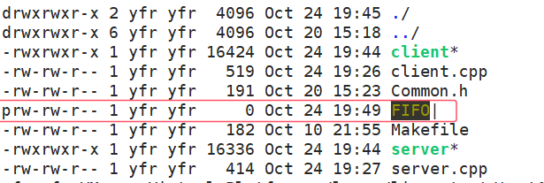之后server进程和client进程就可以通过管道FIFO管道进行通信了,我们当前文件下也会有一个管道文件FIFO,这个管道文件的路径是可以改变的,默认是在当前路径下
