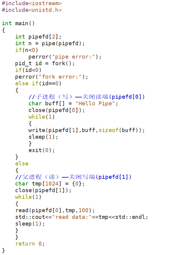 一个进程(通常是父进程)创建管道后,通过 fork() 创建子进程。子进程会继承这两个文件描述符。这样,父子进程就拥有了指向同一个内核缓冲区的通道。