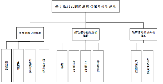 本文以工程机械用电驱动系统40槽8极电机的振动噪声信号为研究对象,在了解电机振动噪声研究的基础上,结合信号与系统、数字信号处理等课程的相关知识,完成工程机械振动噪声信号分析系统各功能模块的设计,编程实现了对振动噪声信号的处理与分析。然后,以MATLAB软件为仿真实现平台,完成该系统的GUI交互界面设计。整个振声噪声信号分析系统主要包括三大功能模块,每个模块所实现的功能各不相同,系统功能模块总体框图如图1.1所示。