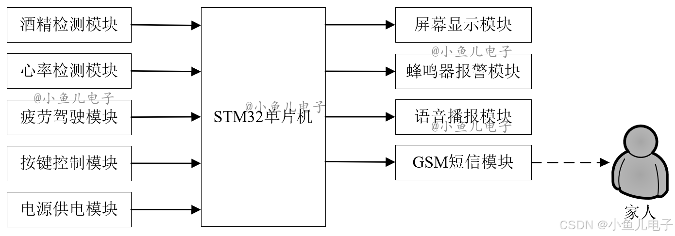 基于 STM32 单片机的驾驶安全监测系统架构,各模块的功能及交互逻辑如下: