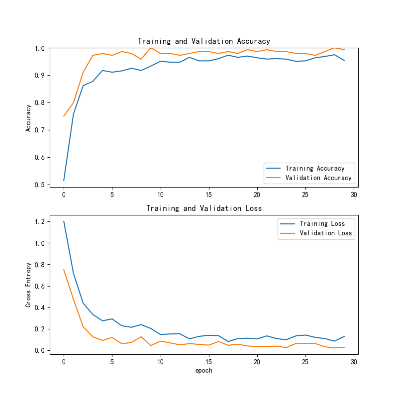 该图展示了模型在训练和验证过程中的准确率与损失变化。训练准确率在初期迅速提升并趋于稳定,验证准确率虽整体上升但略有波动,说明模型在训练集上拟合良好,但在验证集上存在一定的过拟合趋势。训练损失在前期急剧下降后趋于平稳,而验证损失下降较慢并保持在较低水平,表明模型具有较好的学习能力但泛化性能仍需优化。