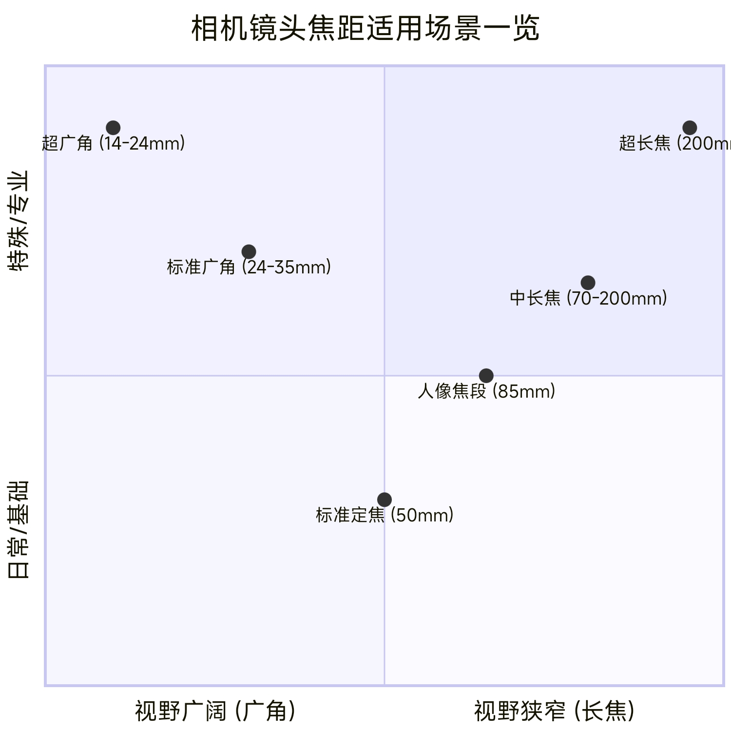为了方便你理解,我制作了下面这张图表,它清晰地展示了不同焦距的视野范围及其最擅长的拍摄领域: