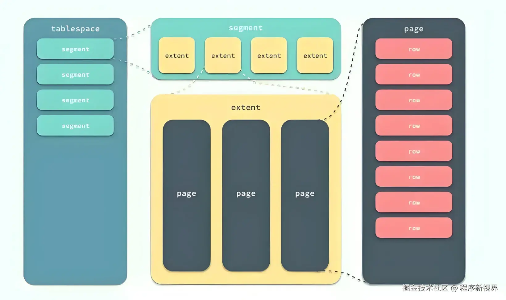 InnoDB存储引擎的逻辑结构是一个层次化的体系,主要由表空间、段、区、页、行(Row)构成。如下图所示。