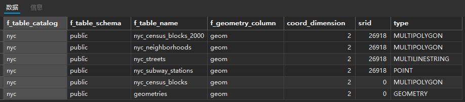 可通过查询该表快速获取数据库中所有空间表的信息,例如: