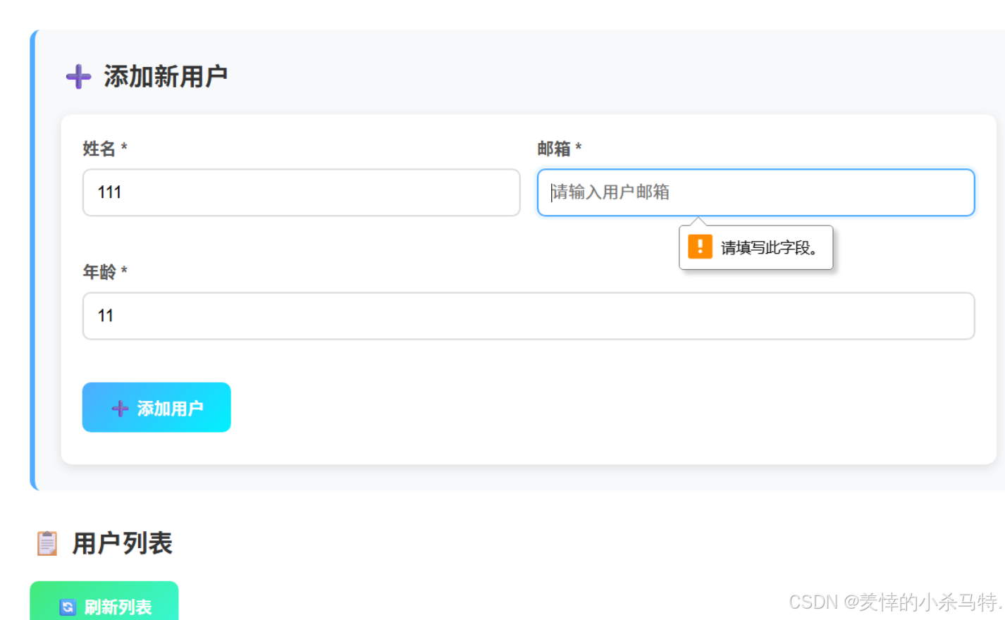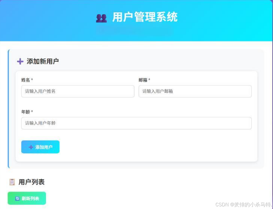 - 该UI界面用于添加和管理用户信息,页面上部为输入姓名、邮箱和年龄的添加表单,右侧有提示icon,下方为蓝色"添加用户"按钮,底部显示"用户列表"标题及绿色"刷新列表"按钮。