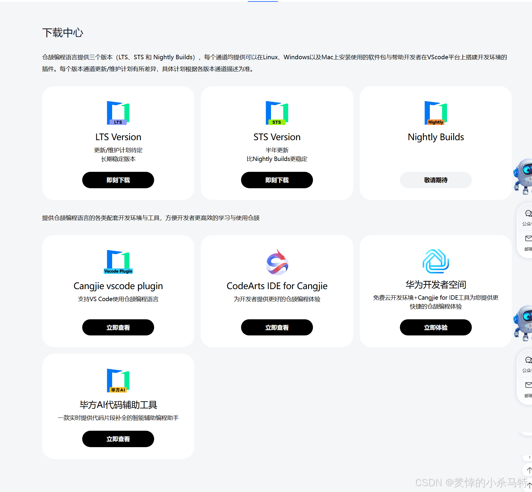 - 仓颉编程语言下载中心提供LTS、STS、Nightly Builds三种版本及VScode插件、CodeArts IDE等配套开发环境与工具,满足不同开发者需求。