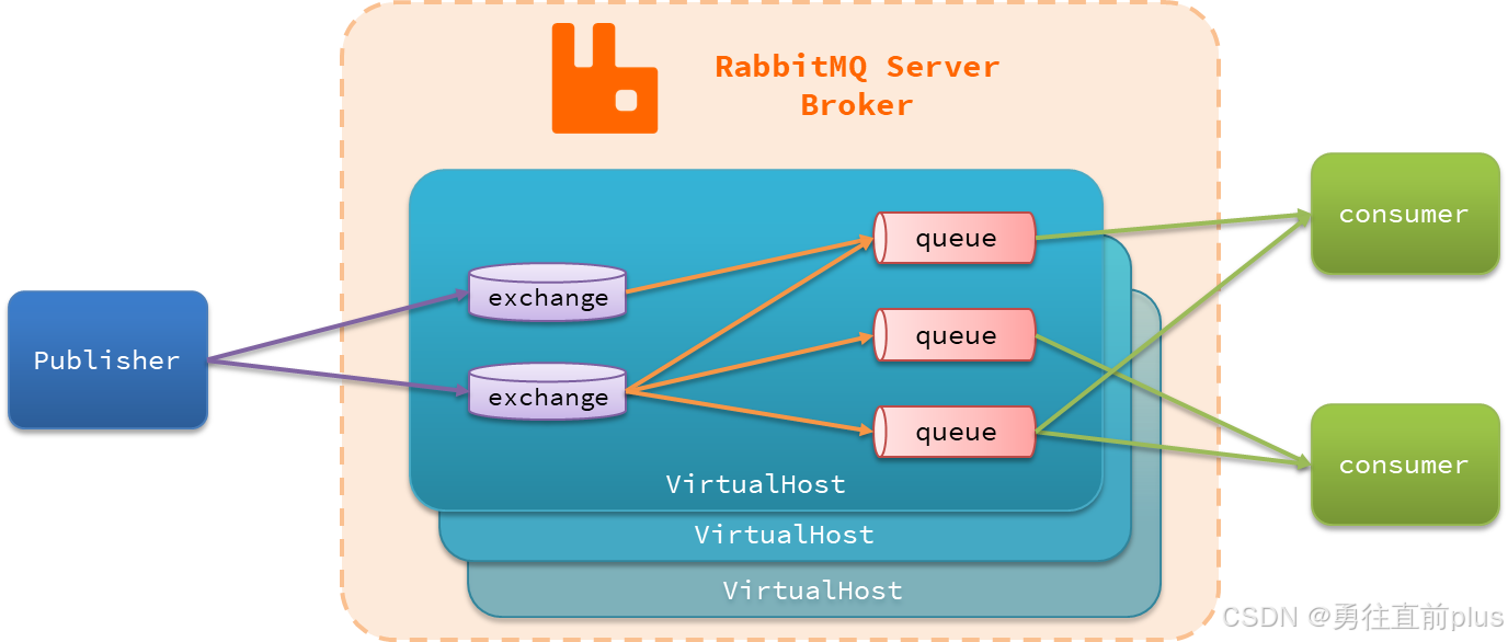 - virtuaHost:虚拟主机,起到虚拟隔离的作用,一个RabbitMQ可以创建多个虚拟主机,在每个虚拟主机上创建交换机exchange和队列queue,作用类似于MySQL中的database,或者pg数据库中的scheme,客户端与RabbitMQ建立连接时,需要指定用户和virtuaHost,因为每个虚拟主机virtuaHost都是归属于某个或者多个用户,每个用户只对归属于自己的虚拟主机有操作权限,而每个虚拟主机上有各自的交换机exchange和队列queue配置。