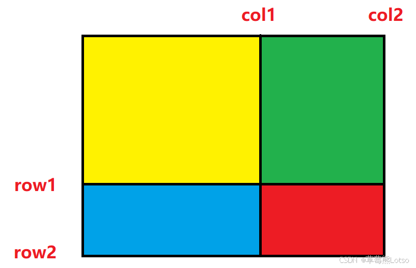 sum表内sum[row1 - 1][col2]的数据; - 同理,蓝色不好求,但是 蓝 + 黄 =