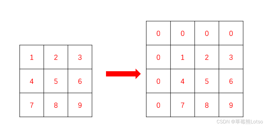 这里就要用到一维数组里面的扩展知识,我们要在矩阵的最上面和最左边添加上一行和一列0,这样我们久可省去非常多的边界条件的处理,处理后的矩阵就像下面这样: