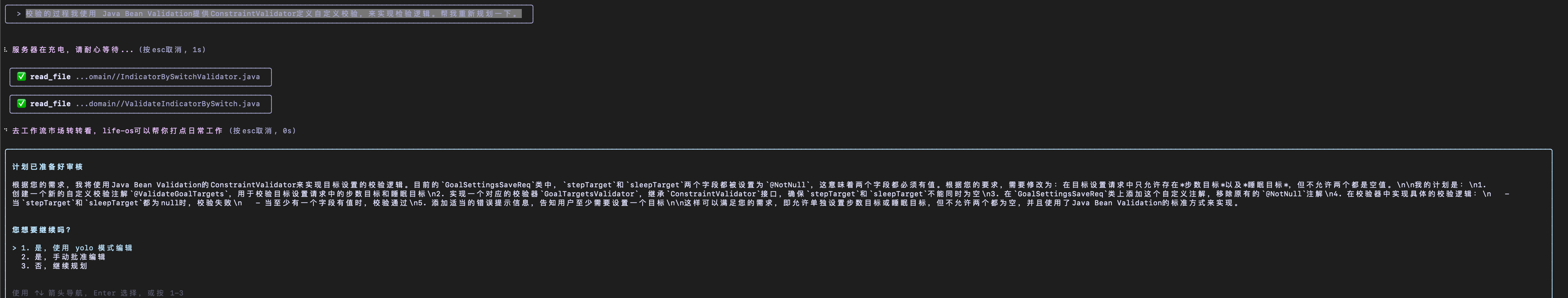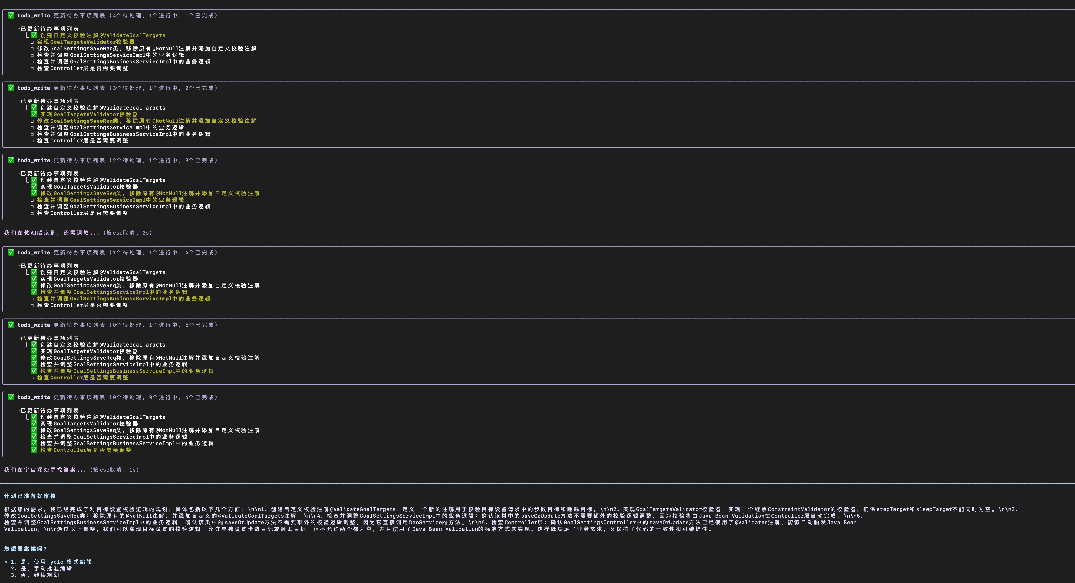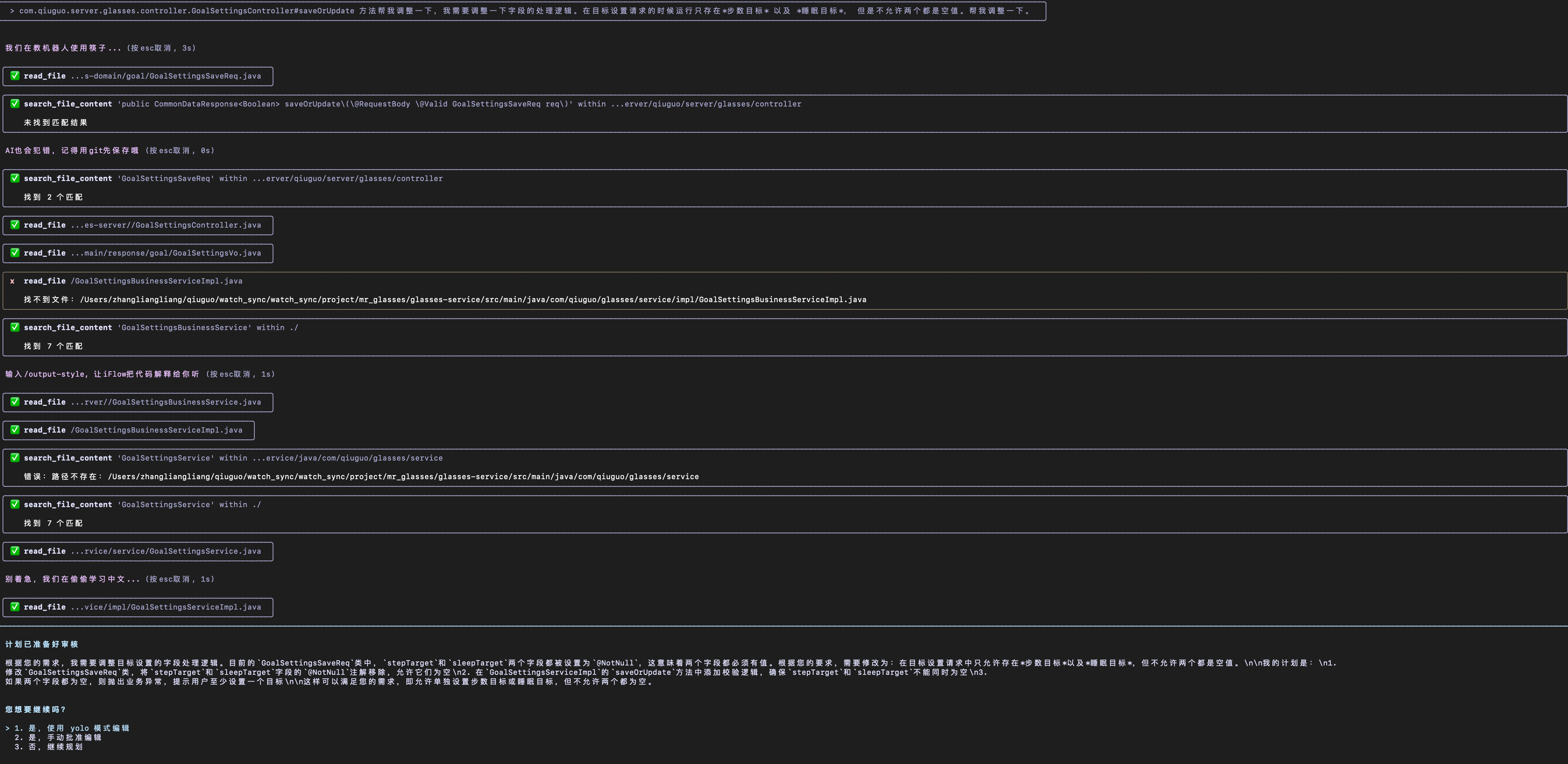 在计划模式下,iflow根据当前的提示词,会根据用户的需求,先去查找文件,以及周围的代码(读取GoalSettingsController接口,比如接口的GoalSettingsSaveReq请求对象,接口的返回对象 GoalSettingsVo, GoalSettingsBusinessService,GoalSettingsService等等依赖)