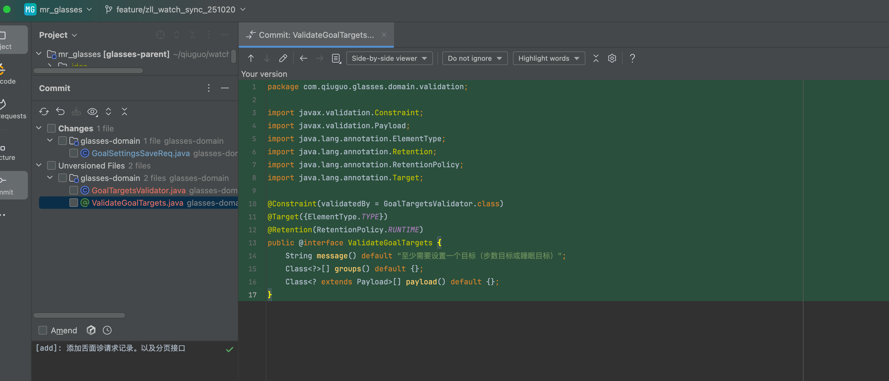 1. 创建一个新的自定义校验注解`@ValidateGoalTargets`,用于校验目标设置请求中的步数目标和睡眠目标