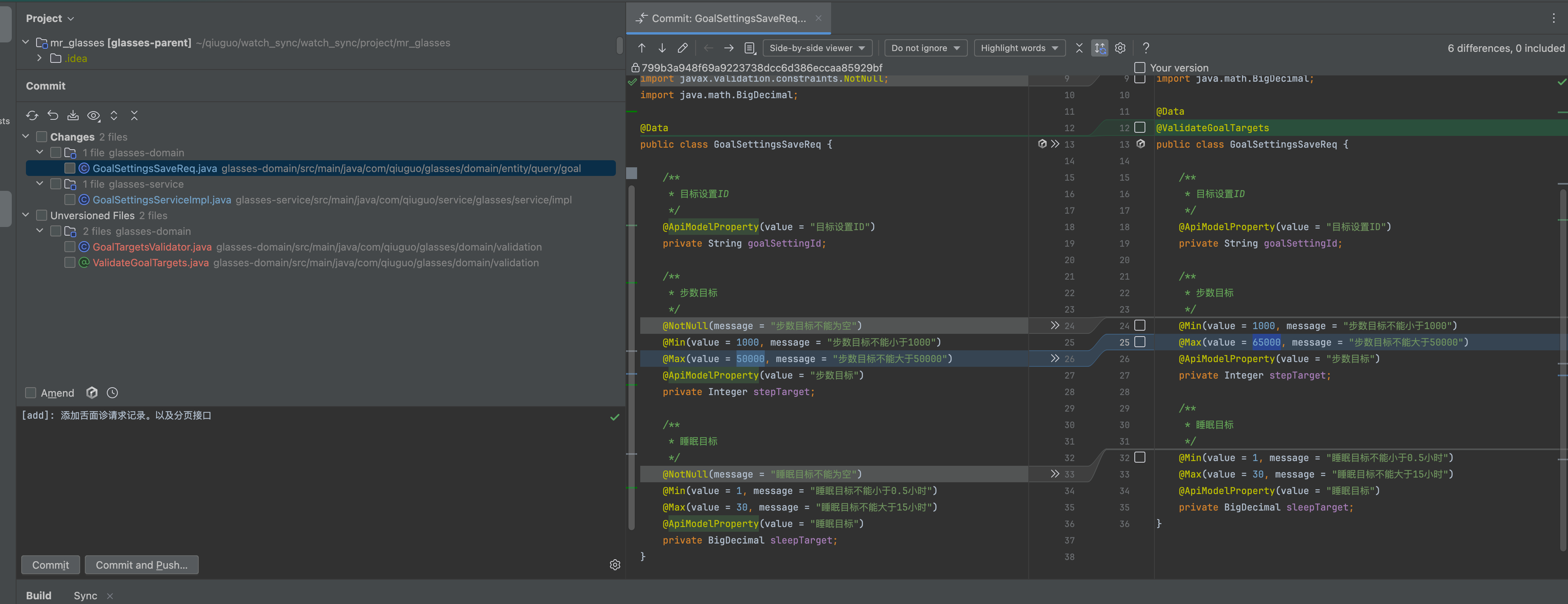 1. 创建自定义校验注解@ValidateGoalTargets:定义一个新的注解用于校验目标设置请求中的步数目标和睡眠目标。