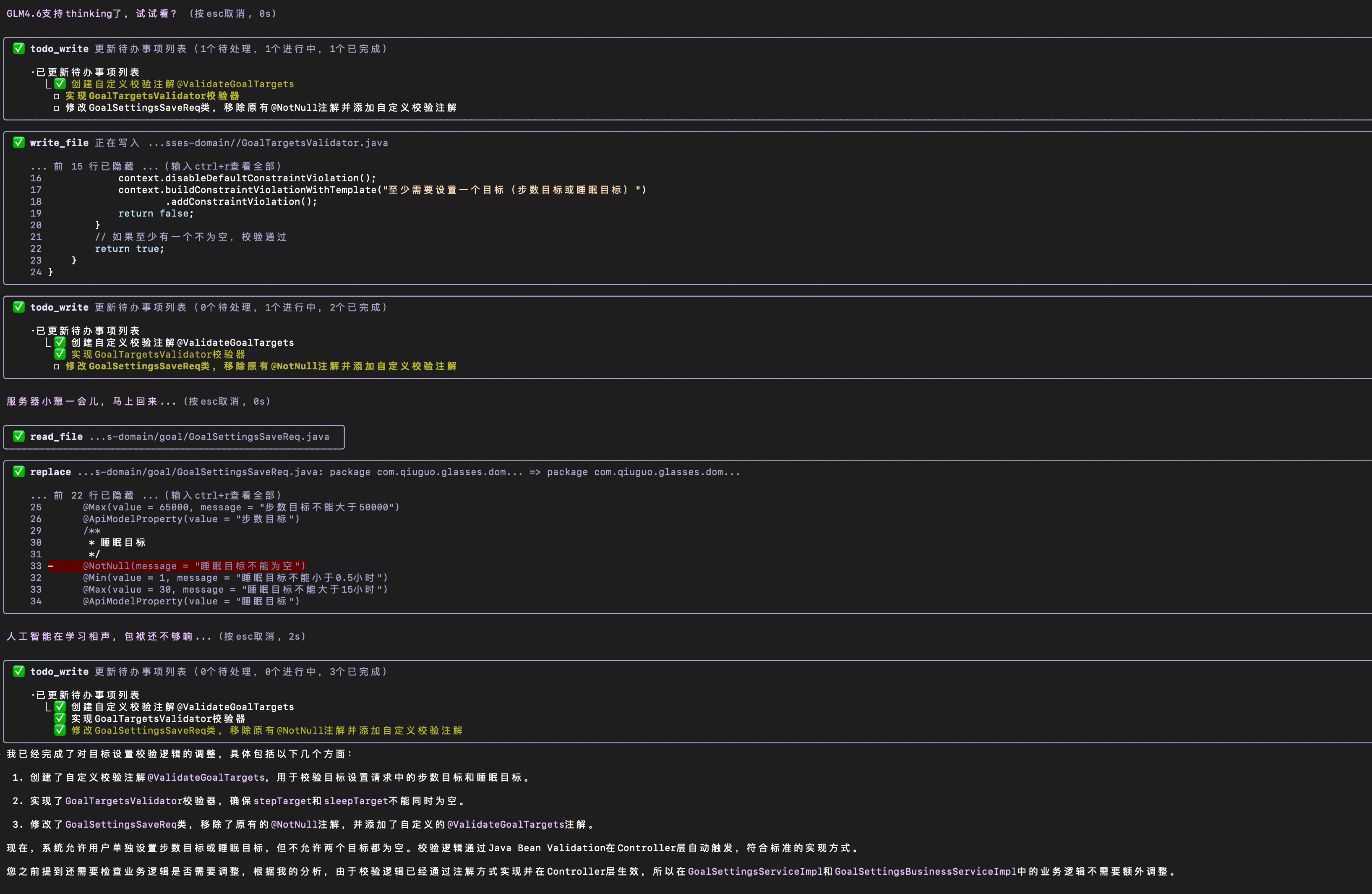 通过以上调整,我们可以实现目标设置的校验逻辑:允许单独设置步数目标或睡眠目标,但不允许两个都为空,并且使用了Java Bean Validation的标准方式来实现。这样既满足了业务需求,又保持了代码的一致性和可维护性。