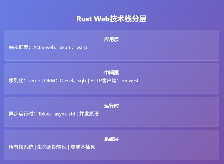 Rust的Web生态系统正在迅速发展,形成了完整的技术栈:
