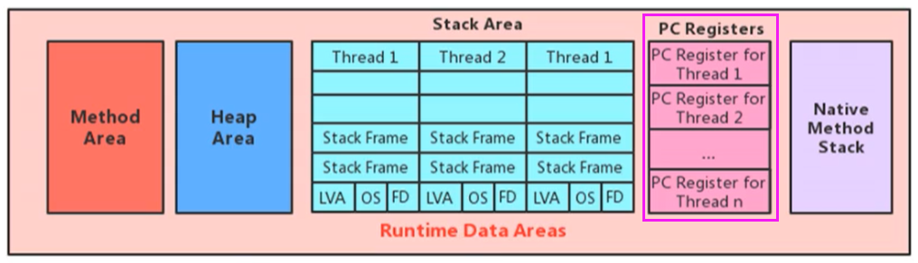 - JVM中的程序计数寄存器(Program Counter Register)中,Register的命名源于CPU的寄存器,寄存器存储指令相关的现场信息。CPU只有把数据装载到寄存器才能够运行。