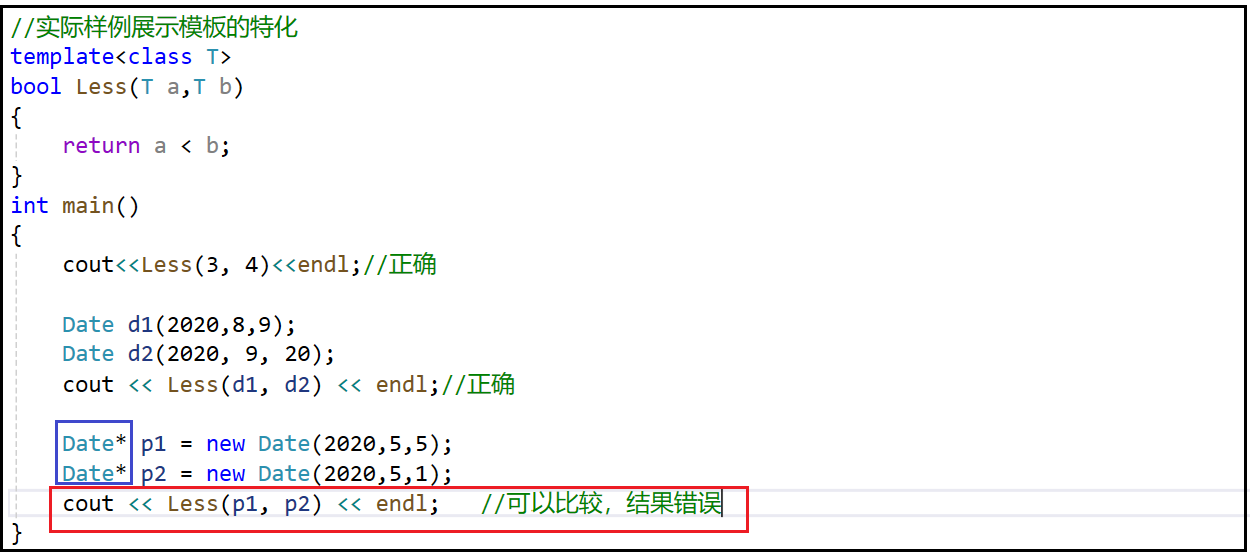 前面两个都可以输出正确的答案,但是第三个确实随机值,这说明对于Date*类型来说,Less比较的是p1和p2本身地址的值,所以出现的都是随机值。那么这个时候就需要对模板进行特化。即:在原模板类的基础上,针对特殊类型所进行特殊化的实现方式。模板特化中分为函数模板特化 与类模板特化: