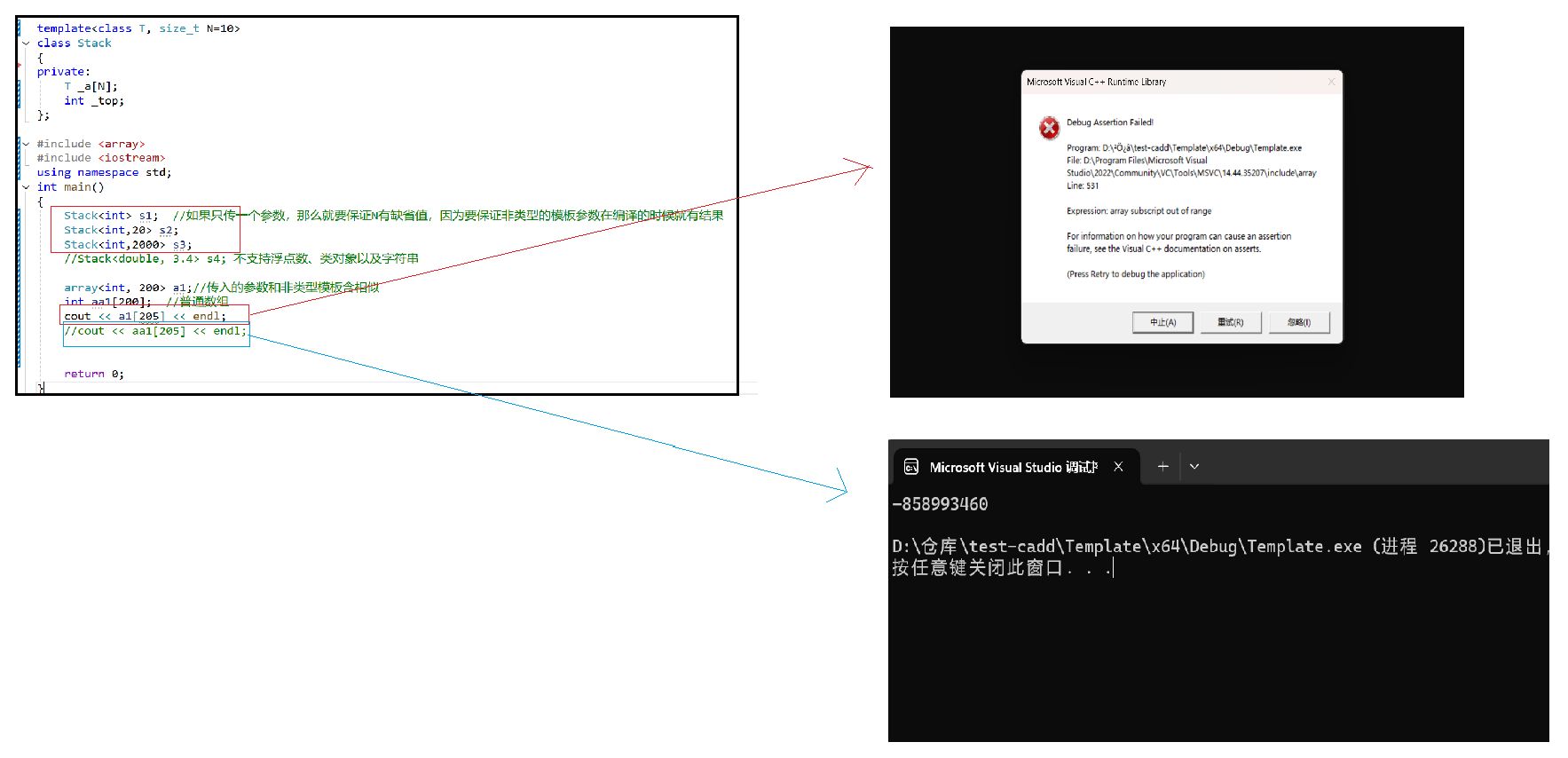 这拿array容器来做比较,array的传参模板与我们举的例子很像,而且都是要在编译期间就要确定大小,当a1运行的时候如果超出了范围会提前中止警告,一定程度上减少错误的发生,但是普通数组的越界访问不做编译期或运行期检查,程序会 "偷偷" 访问内存中数组后面的非法地址(可能是其他变量的内存、无效内存等)可能输出一个随机的垃圾值,也可能导致程序崩溃。而非类型模板参数也同array容器一样,在编译期间如果发生越界,也会提前终止警告。但是我们要注意的非类型模板参数只适用于整型,不适用于浮点数、类对象以及字符串等之类的,(注意C++20以后会支持浮点数等类型)。