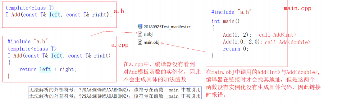 C++程序的运行是经过预处理->编译->汇编->链接四部分完成,头文件是不被编译的,是在预处理阶段被处理的,然后就是.cpp文件生成各自的obj文件进行链接,但是问题就出在a.cpp编译器没有看到Add模板函数的实例化,因此不会生成具体的加法函数,而在main.cpp中有实例化但是却没有找到的函数代码,也就是相互找不到的情况,所以一般来说,我们是不建议分离的。